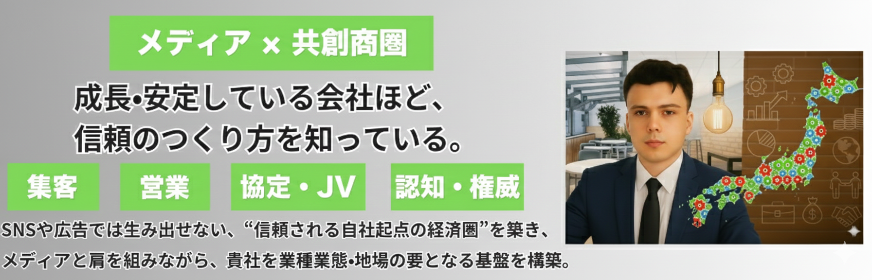 メディアと肩を組み、人を巻き込む商圏構築の成長装置として、信用を積み上げていき、集客・営業・協定・JVなど、企業が次のステージへ踏み出す“突破口”となる基盤を築き上げていきます。